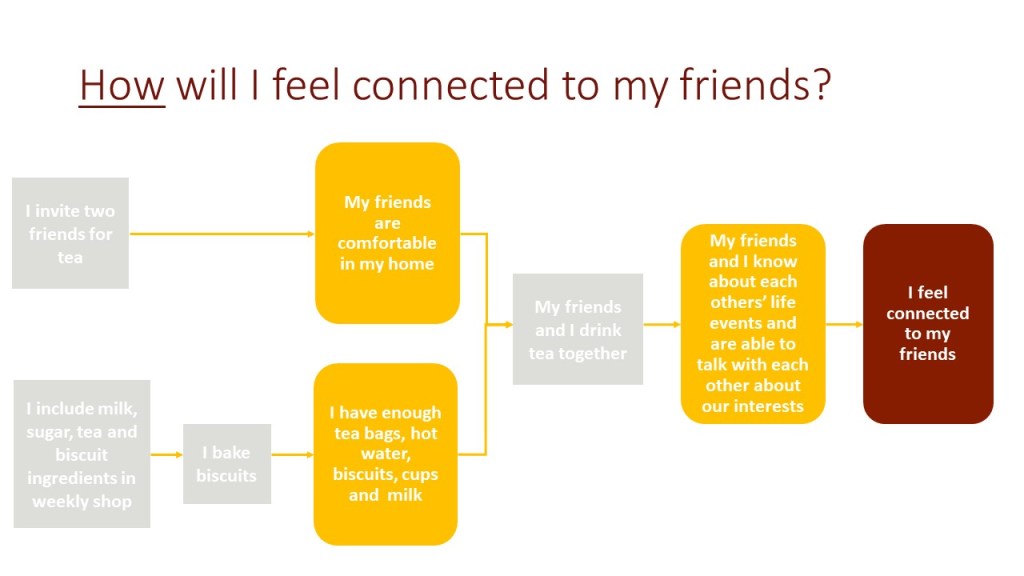 Sure, in this simple Theory of Change we explore how someone wants to be connected to their friends. You can see the red box describes what we ultimately want to achieved (the impact). The yellow boxes describe what needs to change for us to get to the red box. These are referred to as outcomes. The grey boxes tell us what we need to do to make this happen (activities). This allows others to look at how you think your project/program/policy is going to work and whether it is likely to work.